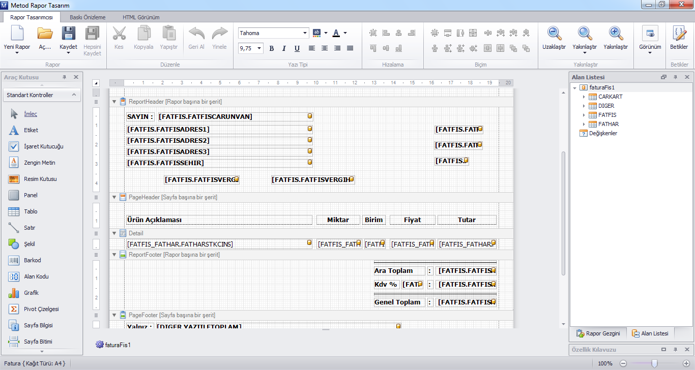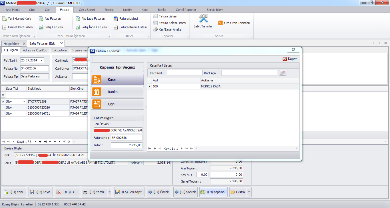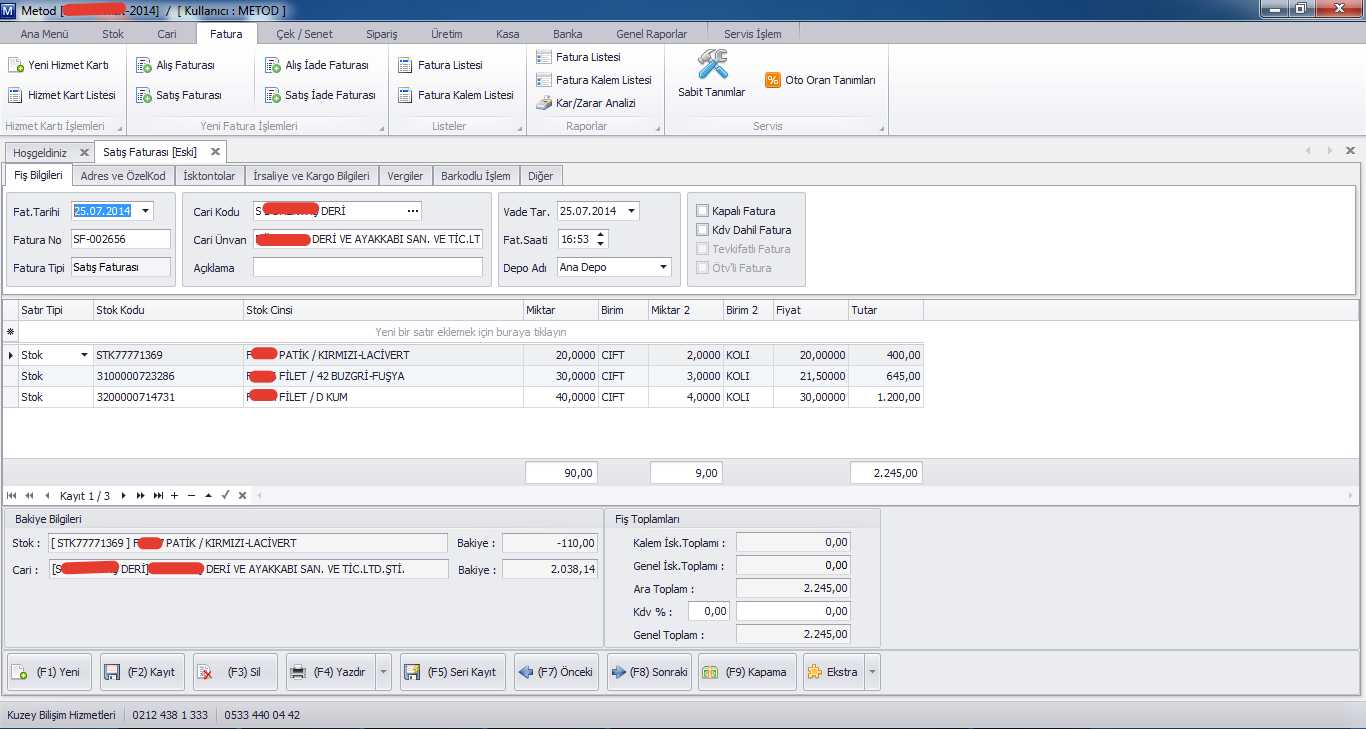 Yalın, Düzenli ve Kolay Anlaşılır ve Kullanılabilir Ara Yüzü ile Metod Fatura Modülünde Alış, Satış ve İade Faturalarınızı İşleyebilirsiniz. Fatura İşlerken Sadece Klavye İle Hızlı İşlem Yapabilir, Tek Tuşla Stok Son Alış-Satış Fiyatlarına Ulaşabilir, Toplu İskonto ve İlave Tanımları Yapıp Kullanabilir, Faturaya Barkodlu Stok Ekleme Yapabilir, Farklı Adres Bilgileri Girebilirsiniz. Hızlı Fatura Kapama ile Tek Tuşla Cari,Kasa yada Banka Modülünü İşleme Alarak Fatura Kapatabilirsiniz. Fatura Dizaynlarını Sürükle Bırak Kolaylığında Görsel Olarak Yapabilirsiniz. Fatura Listesi, Fatura Kalem Listesi Raporlarına Ek Olarak Kar/Zarar Analizi Raporu İle Firmanızı Karlılığını Gerçeğe En Yakın Şekliyle Görebilirsiniz.