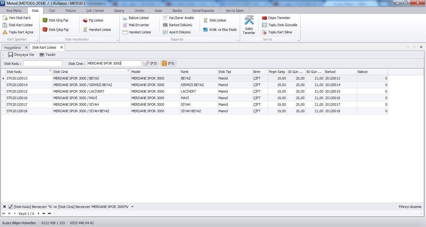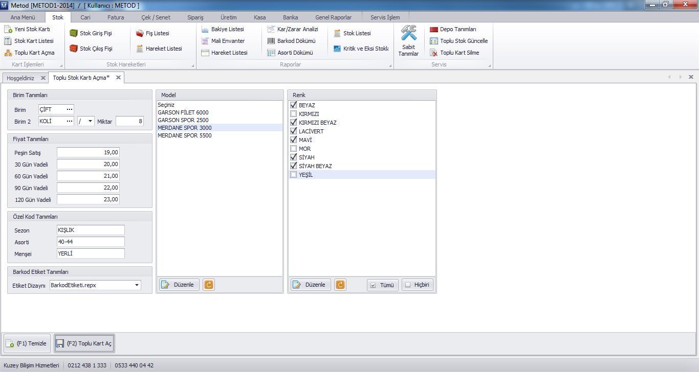 Stok Kartlarınızı, Dinamik Gruplama Alanları ile Firmanıza Göre Özelleştirebilir, 5 Farklı Fiyat Alanı ile Müşteri ve Fiş Bazlı Fiyat Atamaları Yapabilir, Kartlara Otomatik Barkod Numaraları Verebilir, Karta Özel Barkod Etiket Dizaynı Hazırlayabilir, Ayakkabı ve Tekstil Sektöründe Çok Kullanılan Asortileri Karta Özel Tanımlayabilirsiniz… Metod Muhasebe Programına Özgü “Toplu Stok Kartı Açma” Ekranı ile “Model-Renk yada Marka-Ürün” Cinsi gibi Eşleştirmeler ile Toplu Olarak Stok Kartarınızı Açabilirsiniz. Cari den Bağımsız Olarak Stok Giriş-Çıkış İşlemlerinizi Yapabilir, Hareket Listeleri, Bakiye Listesi, Mali Envanter Raporları Alabilirsiniz.